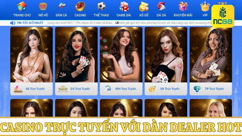 Trải nghiệm sòng bạc trực tuyến với các trò chơi hấp dẫn như Blackjack, Baccarat, Roulette và Poker. Dàn dealer chuyên nghiệp đến từ Philippines, Manila, Campuchia, Europe,… Ngoài ra, NC88 còn cung cấp chương trình liveshow mới lạ như Monopoly, Coin Toss,…