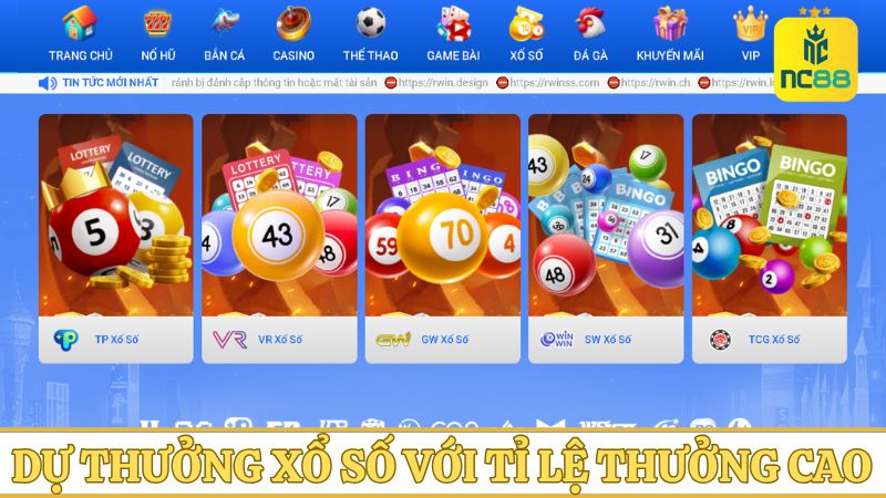 Tham gia xổ số trực tuyến tại NC88 với nhiều loại hình khác nhau như lô đề 3 miền, xổ số siêu tốc, Keno, Mega 6/45,… Người chơi có thể chọn số và chờ đợi kết quả vào các khung giờ quy định. Kỳ quay diễn ra không giới hạn mỗi ngày cho bạn thoải mái dự thưởng.